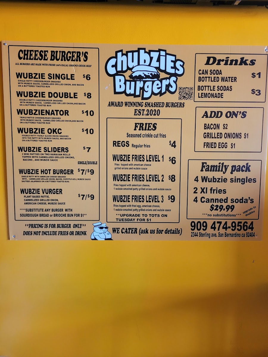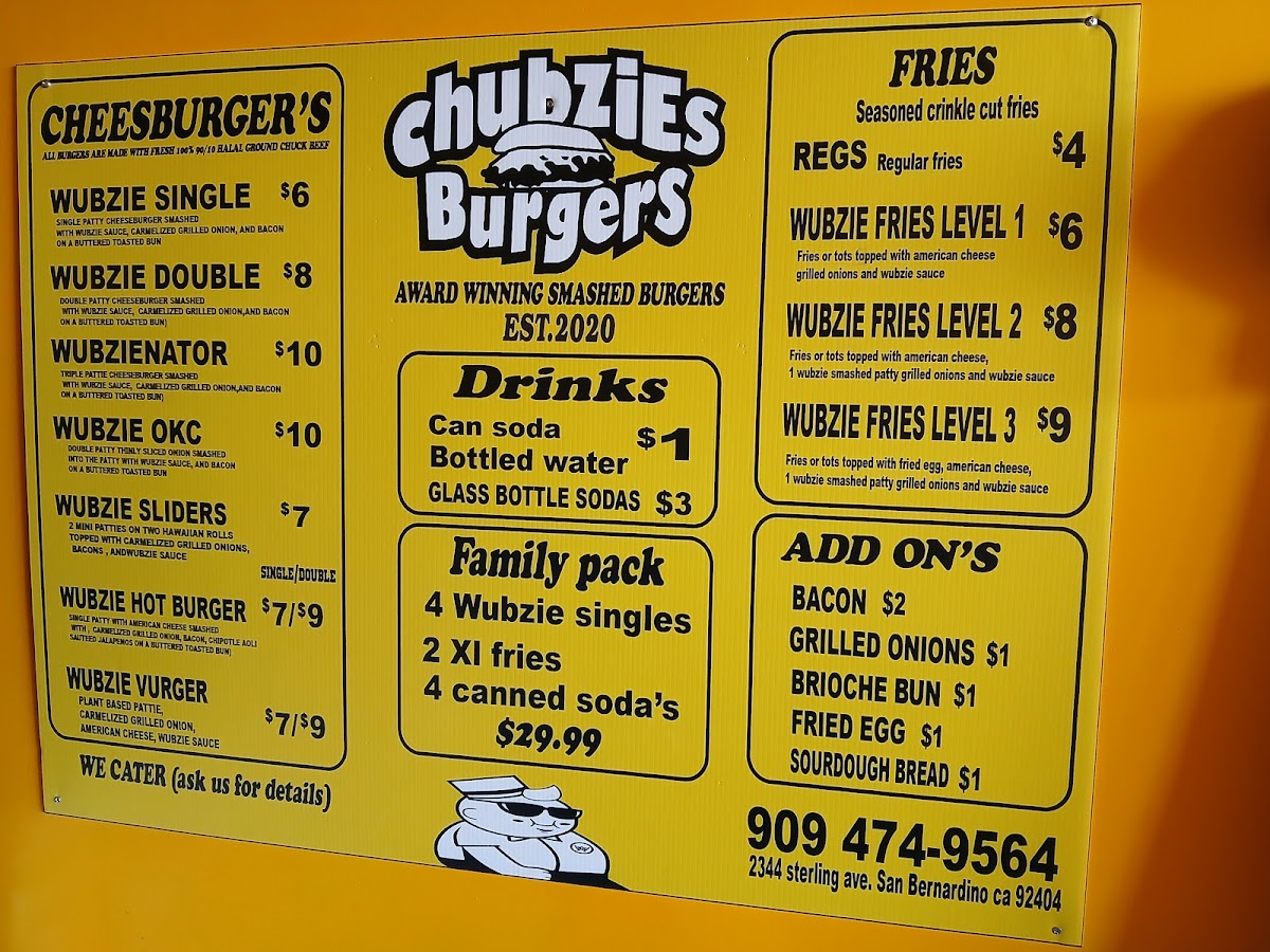 Welcome to Chubzies, a hidden gem located at 2344 Sterling Ave, San Bernardino, CA! Known for its mouthwatering smash burgers, Chubzies has quickly become a beloved spot for burger enthusiasts. The menu features an exciting range of options, from the signature OKC Wuffin, which boasts a delectable sausage patty, bacon, and a fried egg, to vegetarian offerings ensuring everyone finds something satisfying.